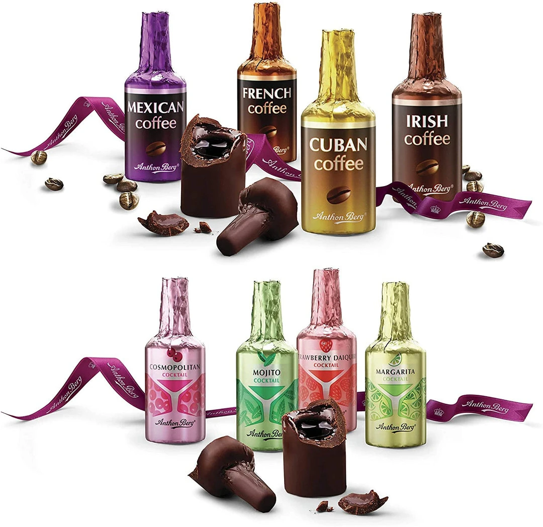 Assorted Liqueur bottles from Anthon Berg featuring genuine spirit liquid centres in dark chocolate. Includes various cocktail and coffee flavours.