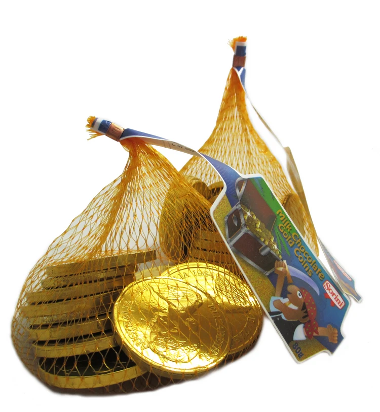 Milk chocolate coins in a mesh bag. Approximately 20 coins per bag.