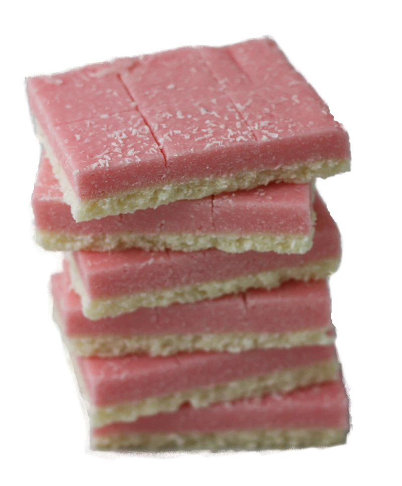 Coconut Ice is layers of Pink and White coconut flavoured sweet confectionery. Made to a traditional recipe this product is an old fashioned favourite. 8 pieces in a slab.