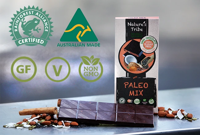 Nature’s Tribe is 65% Cocoa Dark Chocolate that’s completely sugar free! Instead it’s sweetened with all natural, low carb, keto friendly erythritol & stevia. Plus it’s made from sustainably sourced cocoa combined with a delicious paleo mix. 88g