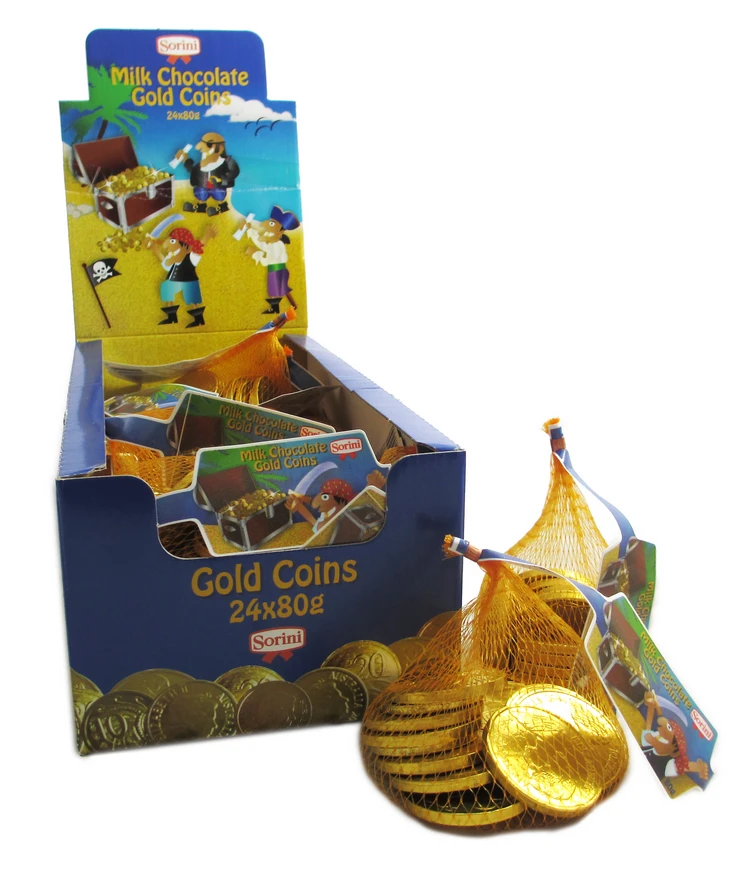 Sorini Milk Chocolate Gold Coins in a box containing 24x80g g mesh bags.